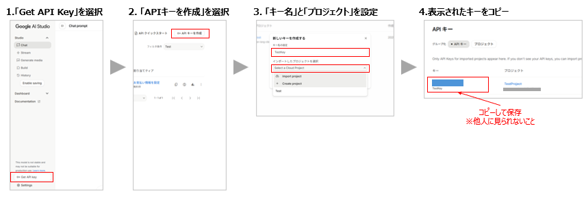 まず、Google AI Studio にアクセスし、以下の手順でAPI Keyを取得します。