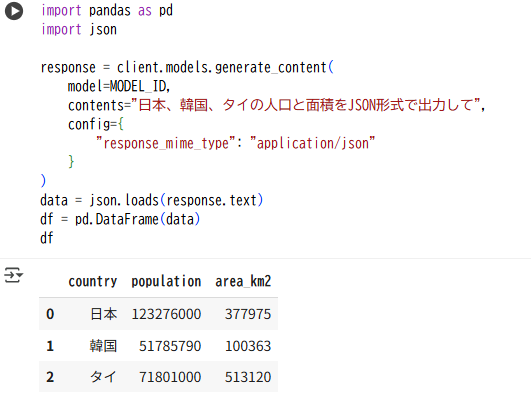 結果はテキストだけでなく、構造化データとしても取得できます。受け取ったJSONはDataFrameに変換でき、生成されたJSONデータを直接Pandasで扱うことで、AIが作成した情報を簡単に分析や可視化に利用できます。