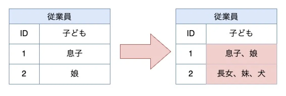 第一正規形はデータベースの原則である、テーブルに含まれるすべての値がスカラ値であるという原則を無視した「複数の値」をセルにいれること