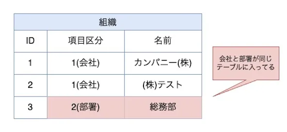 部署や会社といった別の意味を持つものを構造的に似ているということで一つのテーブルにまとめてしまう。