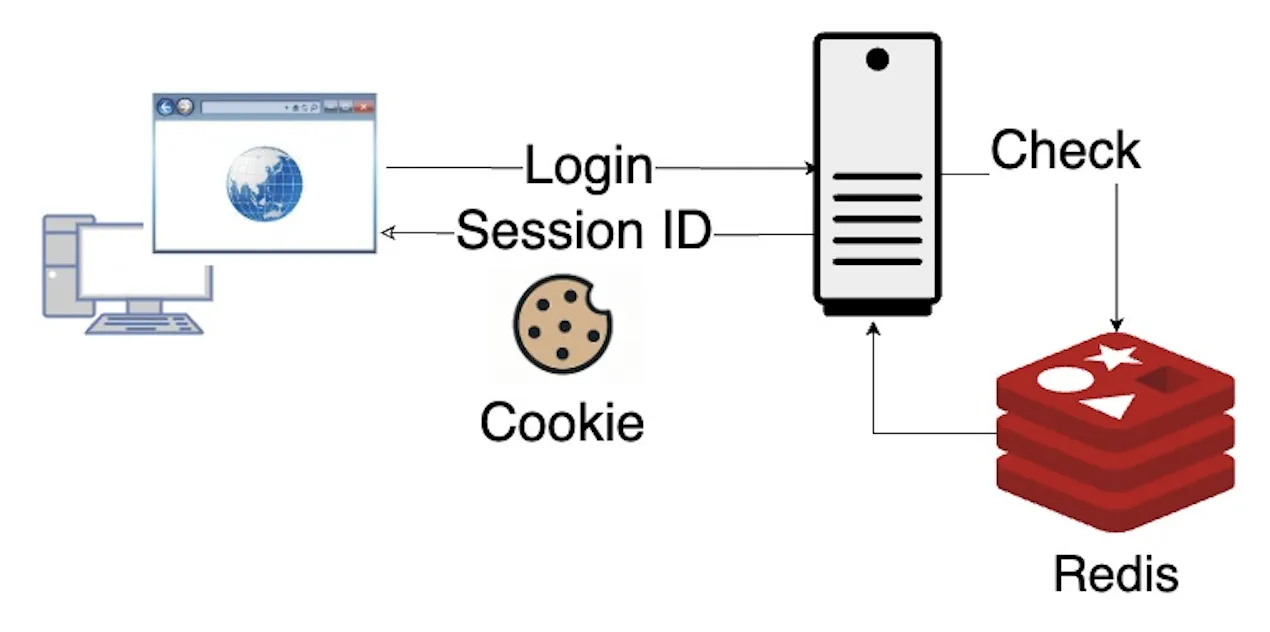 ユーザー(ブラウザ)にはアプリケーションから発行されたセッション変数がCookieとして格納され、ユーザーがサイト訪問した際にそのCookieをアプリケーションに渡してもらうことで アプリケーションはそのユーザーがログインした状態なのかをRedisなどのミドルウェアに格納された値を参照してチェックします。