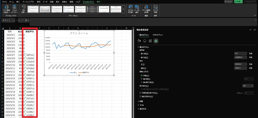 「移動平均」列を手動で追加する必要があり、操作ミスや調整の手間が発生します。