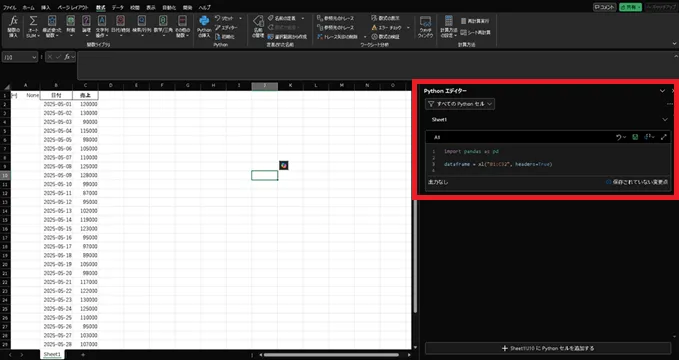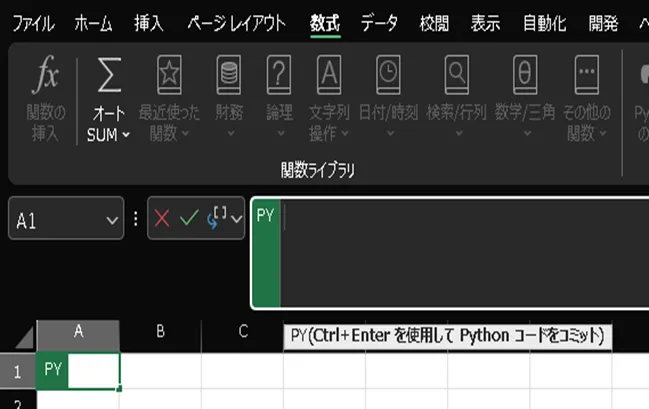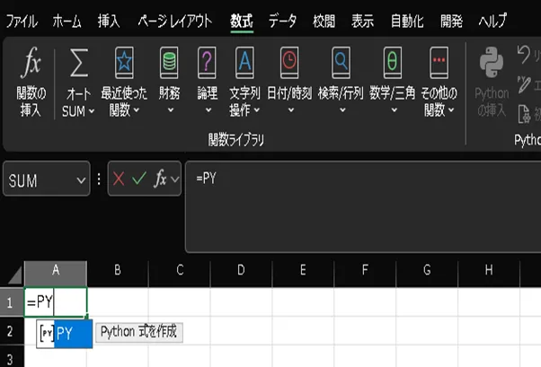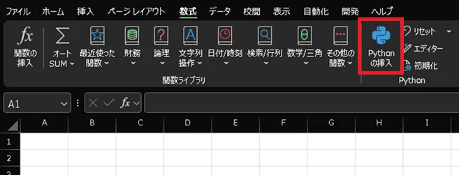 数式タブから「Pythonの挿入」を選択すると、セル内に直接コードを記述できます。