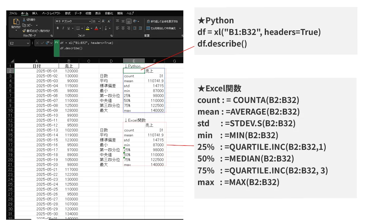 このデータから、PythonとExcel関数を使って、それぞれ要約統計量を取得してみます。