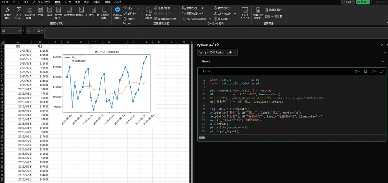 前項で使用したデータを使い、「売上と7日移動平均」の折れ線グラフを作成します。