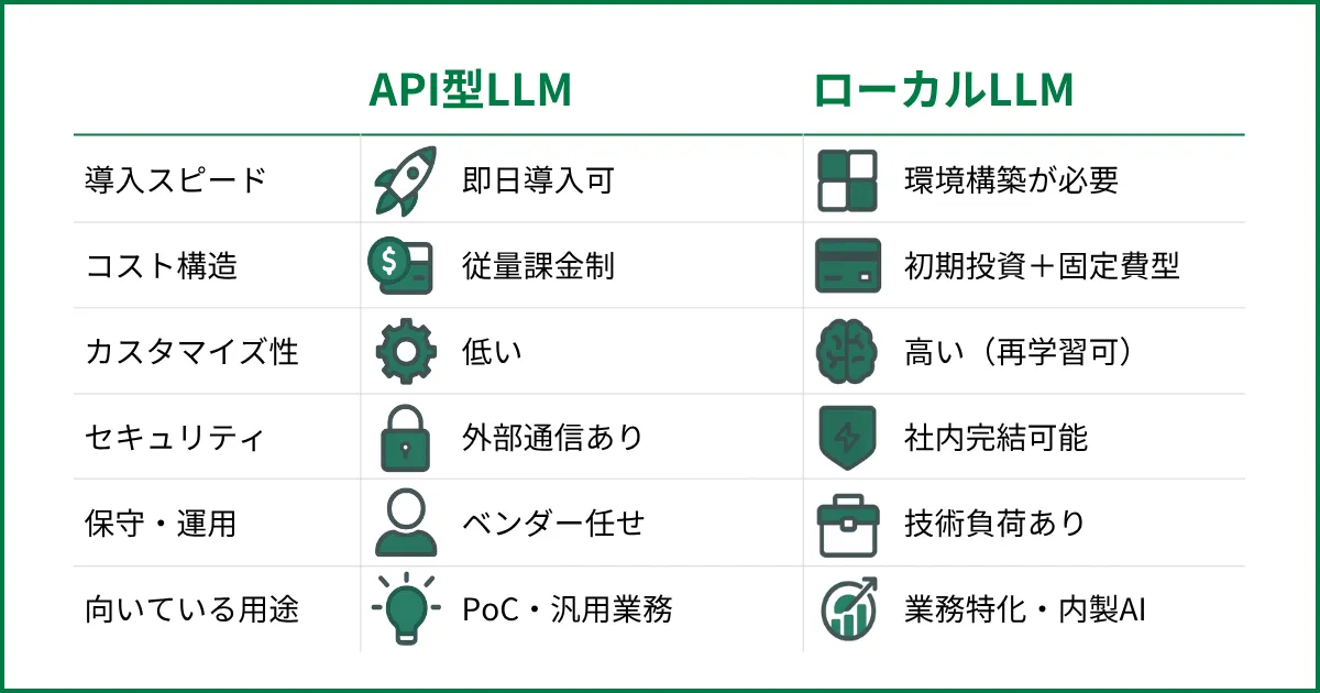 API型LLMは「すぐに高精度なAIを使いたい企業」に向き、ローカルLLMは「自社要件に合わせてカスタマイズしたい企業」に適しています。