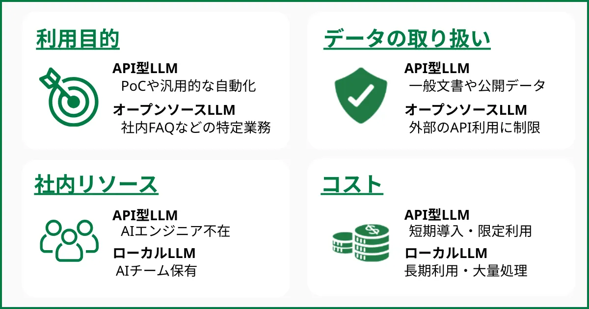 ローカルLLM導入時は「利用目的」「データの取り扱い」「社内リソース」「コスト」の4つの観点で比較検討が必要です。