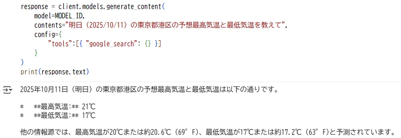 contents="明日(2025/10/11)の東京都港区の予想最高気温と最低気温を教えて",