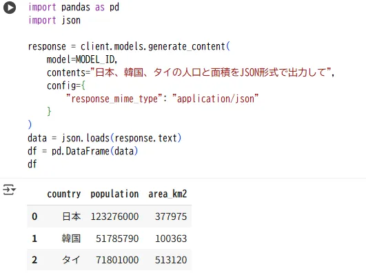 結果はテキストだけでなく、構造化データとしても取得できます。受け取ったJSONはDataFrameに変換でき、生成されたJSONデータを直接Pandasで扱うことで、AIが作成した情報を簡単に分析や可視化に利用できます。