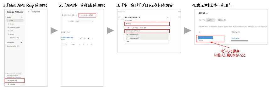 まず、Google AI Studio にアクセスし、以下の手順でAPI Keyを取得します。