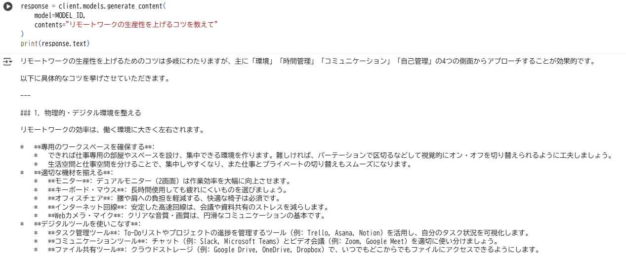 Gemini APIは、以下のコードだけでテキスト生成を行うことができます。